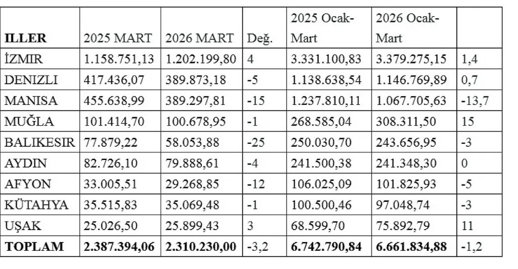Mart ayında Ege Bölgesi illerinden İzmir ve Uşak ihracatlarını artırırken, 7 ilin ihracatı azaldı. İzmir’in ihracatı yüzde 4’lük artışla 1 milyar 158 milyon dolardan 1 milyar 202 milyon dolara ilerlerken, İzmir Ege Bölgesi’nin ihracatından yüzde 52 pay aldı. Uşak’ın ihracatı yüzde 3’lük artışla 25 milyon dolardan 25,9 milyon dolara yükseldi. Denizli 389,8 milyon dolarlık ihracatla İzmir’i takibini sürdürürken, Manisa 389,2 milyon dolarlık ihracat yapma başarısı gösterdi.