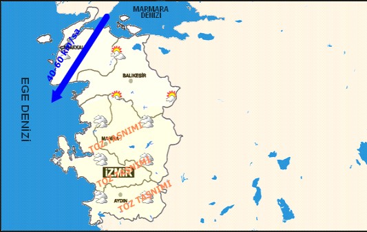Ege Bölgesi genelinde hava parçalı çok bulutlu, sabah saatlerinden itibaren Denizli, Muğla, Uşak ve Aydın’ın iç kesimleri ile Afyon Karahisar’da aralıklı sağanak ve gök gürültülü sağanak yağışlı olacak. Bölgenin güneyinde Muğla ve Aydın’da yer yer toz taşınımı bekleniyor.