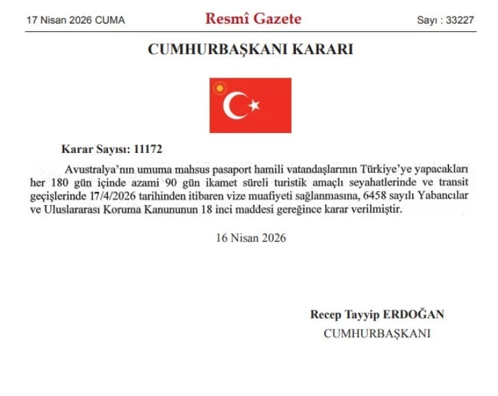 Resmi Gazete’de yayımlanan kararla, “Avustralya’nın umuma mahsus pasaport hamili vatandaşlarının Türkiye’ye yapacakları her 180 gün içinde azami 90 gün ikamet süreli turistik amaçlı seyahatlerinde ve transit geçişlerinde 17 Nisan 2026 tarihinden itibaren vize muafiyeti sağlandığı” duyuruldu.