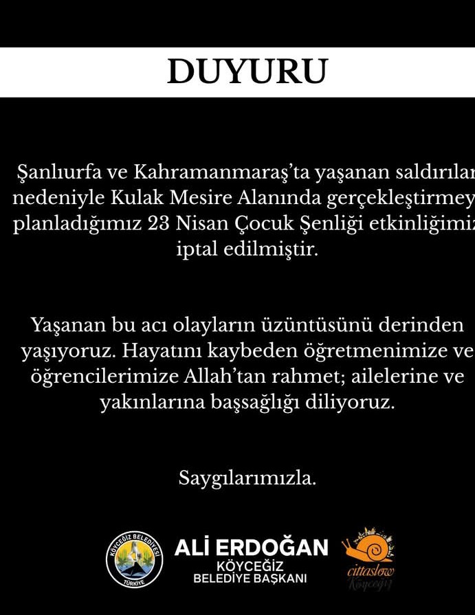 Köyceğiz Belediye Başkanı Ali Erdoğan, 23 Nisan Çocuk Bayramı kapsamında Kulak Mesire Alanı’nda yapılması planlanan 23 Nisan Çocuk Şenliği’nin iptal edildiğini duyurdu. İzmir’in Çeşme İlçesi’nde başlayan Alaçatı Ot Festivali’nin konser etkinlikleri de aynı nedenle iptal edildi.