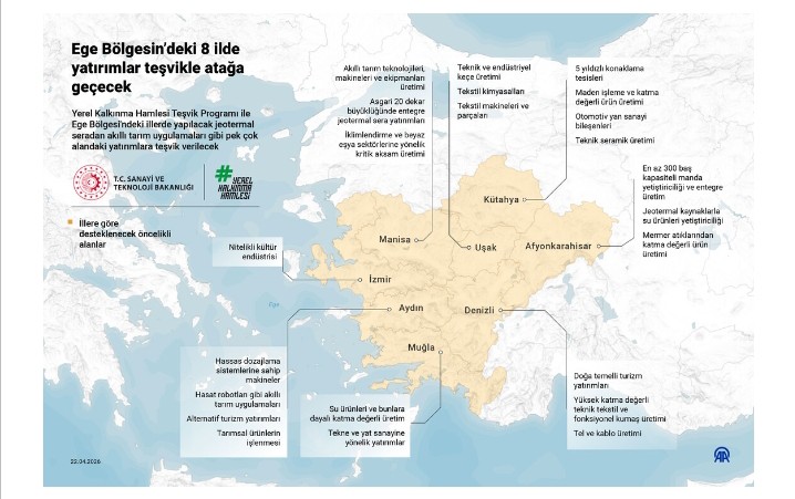 Sanayi ve Teknoloji Bakanlığı koordinasyonundaki Yerel Kalkınma Hamlesi Teşvik Programı kapsamında Ege Bölgesi’ndeki 8 şehre destek geliyor. Bölgenin yerel üretim potansiyelinin değerlendirilmesi amacıyla atıl kaynakların harekete geçirilmesine yönelik programla kalkınmanın yerelden başlatılması için destek sağlanacak.