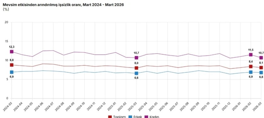 Türkiye İstatistik Kurumu (TÜİK) tarafından yayımlanan Hanehalkı İşgücü Araştırması sonuçlarına göre; 15 ve daha yukarı yaştaki kişilerde işsiz sayısı 2026 yılı mart ayında bir önceki aya göre 96 bin kişi azalarak 2 milyon 873 bin kişi oldu. İşsizlik oranı ise 0,3 puan azalarak yüzde 8,1 seviyesinde gerçekleşti. İşsizlik oranı erkeklerde yüzde 6,8 iken kadınlarda yüzde 10,7 olarak tahmin edildi.